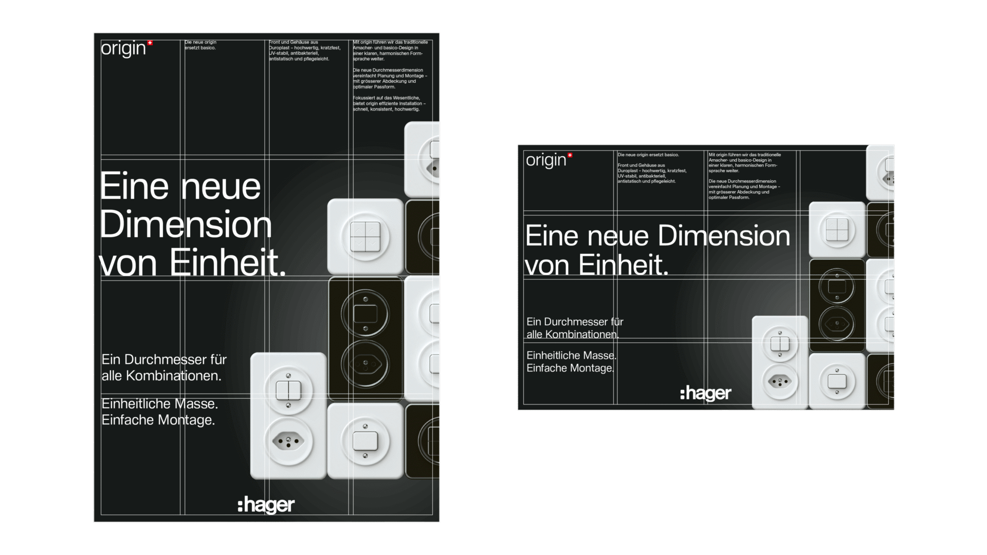 Das Keyvisual bildet das Fundament der Kampagne. Ergänzt wird es durch animierte Ads, digitale Umsetzungen, Social-Media-Formate sowie Printinserate, Flyer und PR-Texte. Über alle Kanäle hinweg entsteht ein konsistenter Auftritt, der origin als Swiss Made Lösung positioniert: reduziert, präzise und kompromisslos ästhetisch.